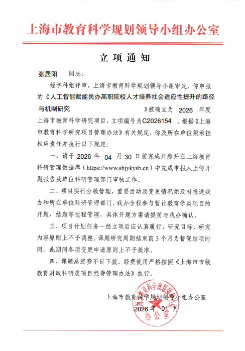 在“十五五”开局之年,我校科研工作迎来开门红!近日,从上海市教育科学规划领导小组办公室传来喜讯,在2026年度上海市教育科学研究项目立项名单中,我校张居阳申报的《人工智能赋能民办高职院校人才培养社会适应性提升的路径与机制研究》(立项编号C2026154)、王改申报的《低空经济产业变革下职业教育“空-地”协同型技能人才培养模式研究》(立项编号C2026220),双双荣列!我校已经连续两年在上海市教育科研项目立项中获得“双重”惊喜!