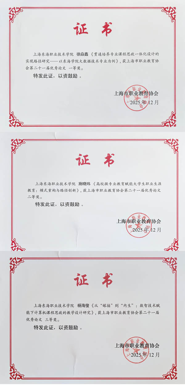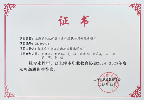 在优秀论文评选中,信息工程学院徐焱鑫的论文《贯通培养专业课程思政一体化设计的实现路径研究——以东海学院大数据技术专业为例》荣获一等奖;马克思主义学院施晓玮的论文《高校微专业教育赋能大学生职业生涯教育:模式重构与路径创新》获得二等奖;信息工程学院杨海俊的论文《从“嫁接”到“内生”:数智技术赋能下计算机课程思政的教学设计研究》获得三等奖。在2024-2025立项课题结题评审中,教育学院朱琼玲开展两年研究的结项课题《上海高职教师数字素养现状与提升策略研究》荣获优秀项目奖。